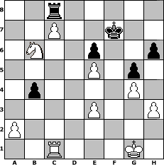 Partie-Notation im PGN-Format [Event "YOUR LAST BREATH"] [Site "www.mySchach.de"] [Date "2019.11.17"] [Round "2"] [White "Gauss1233"] [Black "martinus"] [ECO "B20"] [WhitemyELO "1428"] [BlackmyELO "1718"] [Result "1-0"] [TimeControl "10/3456000"] [WhiteDays "40"] [BlackDays "40"] [MySchachNr "116356"] 1. e4 c5 2. d4 cxd4 3. Qxd4 Nc6 4. Qd1 Nf6 5. Bd3 e6 6. Nf3 Bc5 7. h3 Qb6 8. O-O h6 9. Qe2 O-O 10. c3 Re8 11. e5 Nd5 12. c4 Ndb4 13. Nc3 Nxd3 14. Qxd3 Bd4 15. Nxd4 Qxd4 16. Qxd4 Nxd4 17. Bf4 b6 18. Be3 Nc2 19. Rac1 Nxe3 20. fxe3 Bb7 21. Nb5 Rec8 22. Nd6 Rc7 23. Nxf7 Rf8 24. Nd6 Bc6 25. Rxf8+ Kxf8 26. Rf1+ Kg8 27. b4 Ba4 28. Rc1 g5 29. b5 Rc5 30. Ne4 Rc7 31. g4 a6 32. bxa6 b5 33. c5 Rc6 34. Nf6+ Kf7 35. Nxd7 Rxa6 36. c6 b4 37. Nb8 Ra8 38. c7 Bd7 39. Nxd7 Rc8 40. Nb6 1-0 Stellungs-Notation im FEN-Format 2r5/2P2k2/1N2p2p/4P1p1/1p4P1/4P2P/P7/2R3K1 - - - 2 40 Geschlagene Figuren Weiss: Geschlagene Figuren Schwarz: Klicken Sie auf eine geschlagene Figur um den gewünschten Zug darzustellen!