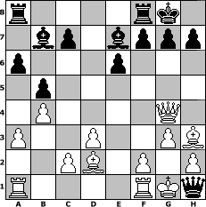 Partie-Notation im PGN-Format [Event "Nach-WM-Turnier"] [Site "www.mySchach.de"] [Date "2006.07.24"] [Round "1"] [White "crca108"] [Black "pluc1979"] [ECO "B01"] [WhitemyELO "1440"] [BlackmyELO "1472"] [Result "0-1"] [TimeControl "10/864000"] [WhiteDays "20"] [BlackDays "20"] [MySchachNr "27150"] 1. e4 d5 2. exd5 Qxd5 3. Nc3 Qd6 4. Nb5 Qd7 5. g3 a6 6. Nc3 Nf6 7. Bh3 e6 8. Nf3 Nc6 9. a3 b5 10. Qe2 Bb7 11. O-O Bd6 12. d3 O-O 13. Bg5 Be7 14. b4 Nd4 15. Nxd4 Qxd4 16. Bd2 Nd5 17. Nxd5 Qxd5 18. Qg4 Qh1# 0-1 Stellungs-Notation im FEN-Format r4rk1/1bp1bppp/p3p3/1p6/1P4Q1/P2P2PB/2PB1P1P/R4RKq - - - 2 19 Geschlagene Figuren Weiss: Geschlagene Figuren Schwarz: Klicken Sie auf eine geschlagene Figur um den gewünschten Zug darzustellen!