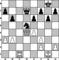 Partie-Notation im PGN-Format [Event "Winterende"] [Site "www.mySchach.de"] [Date "2024.03.15"] [Round "1"] [White "deepsabel"] [Black "Seneca"] [Variant "Fischerrandom"] [SetUp "1"] [FEN "bqnbnrkr/pppppppp/8/8/8/8/PPPPPPPP/BQNBNRKR w KQkq - 0 1"] [WhitemyELO "1765"] [BlackmyELO "1501"] [Result "1-0"] [TimeControl "10/3456000"] [WhiteDays "120"] [BlackDays "118"] [MySchachNr "131702"] 1. c4 c5 2. b3 e6 3. Nf3 Bf6 4. d4 d6 5. Bc2 g6 6. Rd1 Ne7 7. e3 b6 8. O-O Bxf3 9. gxf3 Nc6 10. Ne2 Nc7 11. Ng3 Nb4 12. a3 Nxc2 13. Qxc2 Qb7 14. Qe4 d5 15. cxd5 Nxd5 16. Rc1 cxd4 17. Bxd4 Bxd4 18. Qxd4 Rc8 19. Ne4 O-O 20. Nd6 Qd7 21. Nxc8 Rxc8 22. e4 Rxc1 23. Rxc1 1-0 Stellungs-Notation im FEN-Format 6k1/p2q1p1p/1p2p1p1/3n4/3QP3/PP3P2/5P1P/2R3K1 - - - 0 23 Geschlagene Figuren Weiss: Geschlagene Figuren Schwarz: Klicken Sie auf eine geschlagene Figur um den gewünschten Zug darzustellen!