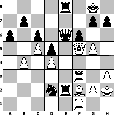 Partie-Notation im PGN-Format [Event "Wrixum - Open die XII"] [Site "www.mySchach.de"] [Date "2014.10.09"] [Round "1"] [White "UPS"] [Black "FrankB"] [ECO "C01"] [WhitemyELO "1650"] [BlackmyELO "1739"] [Result "0-1"] [TimeControl "10/2592000"] [WhiteDays "067"] [BlackDays "104"] [MySchachNr "96306"] 1. e4 e6 2. d4 d5 3. exd5 exd5 4. Nf3 Bd6 5. Nc3 Ne7 6. Be3 Bf5 7. Bd3 c6 8. O-O O-O 9. h3 Nd7 10. Ne2 f6 11. Ng3 Bg6 12. b3 Re8 13. Nh4 Nf8 14. Bxg6 Nfxg6 15. Nhf5 Bxg3 16. Nxg3 Qd7 17. Qd3 Nh4 18. Nh5 Nef5 19. Rae1 Qf7 20. Ng3 Nxg3 21. fxg3 Ng6 22. Rf3 Re7 23. Ref1 Rae8 24. c3 Re4 25. a3 Qe7 26. Re1 Qxa3 27. c4 Qd6 28. c5 Qd7 29. b4 Ne7 30. Ref1 Qe6 31. Bf2 Nf5 32. g4 Ne3 33. Ra1 a6 34. Kh2 Nc4 35. Rf1 Nb2 36. Qb1 Re2 37. Qf5 Nc4 38. g5 Nd2 0-1 Stellungs-Notation im FEN-Format 4r1k1/1p4pp/p1p1qp2/2Pp1QP1/1P1P4/5R1P/3nrBPK/5R2 - - - 1 39 Geschlagene Figuren Weiss: Geschlagene Figuren Schwarz: Klicken Sie auf eine geschlagene Figur um den gewünschten Zug darzustellen!