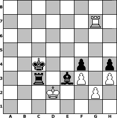 Partie-Notation im PGN-Format [Event "Bobby Fischer Ged"] [Site "www.mySchach.de"] [Date "2008.02.01"] [Round "1"] [White "deepsabel"] [Black "dbuse"] [ECO "E47"] [WhitemyELO "1779"] [BlackmyELO "1580"] [Result "0-1"] [TimeControl "10/864000"] [WhiteDays "63"] [BlackDays "63"] [MySchachNr "42212"] 1. d4 Nf6 2. c4 e6 3. Nc3 Bb4 4. e3 O-O 5. Bd3 c5 6. Nge2 d5 7. cxd5 cxd4 8. exd4 Nxd5 9. O-O Re8 10. Bc2 Nc6 11. a3 Bf8 12. Qd3 g6 13. Rd1 Bg7 14. Ne4 Nce7 15. Bg5 h6 16. Bd2 Qb6 17. Nc5 e5 18. Rac1 exd4 19. Ba4 Nc6 20. b4 Bg4 21. f3 Bf5 22. Qc4 Rad8 23. Ng3 Bc8 24. Nge4 f5 25. Re1 Re7 26. Nf2 Rxe1+ 27. Rxe1 Ne5 28. Qc1 Kh7 29. Bb3 Qd6 30. Ncd3 Nxd3 31. Nxd3 Ne3 32. b5 Be6 33. Bxe6 Qxe6 34. Qc7 Qd7 35. Qxd7 Rxd7 36. a4 Rc7 37. Bxe3 dxe3 38. Kf1 Rc3 39. Rxe3 f4 40. Re7 Rxd3 41. Rxb7 a6 42. bxa6 Rd4 43. Ke2 Rxa4 44. a7 g5 45. Kd3 h5 46. Rb5 Bf6 47. Rb7+ Kg6 48. Rc7 h4 49. Rd7 Kf5 50. Rb7 Be5 51. h3 Ke6 52. Rb6+ Bd6 53. Rb5 Be7 54. Rb6+ Kd5 55. Rb7 Ra3+ 56. Kc2 Bc5 57. Rg7 Bxa7 58. Rxg5+ Kc4 59. Rg7 Rc3+ 60. Kd2 Be3+ 0-1 Stellungs-Notation im FEN-Format 8/6R1/8/8/2k2p1p/2r1bP1P/3K2P1/8 - - - 5 61 Geschlagene Figuren Weiss: Geschlagene Figuren Schwarz: Klicken Sie auf eine geschlagene Figur um den gewünschten Zug darzustellen!