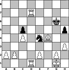 Partie-Notation im PGN-Format [Event "MI6 Contest"] [Site "www.mySchach.de"] [Date "2009.04.14"] [Round "1"] [White "Robur"] [Black "augustus"] [ECO "C41"] [WhitemyELO "1752"] [BlackmyELO "1255"] [Result "1-0"] [TimeControl "10/3456000"] [WhiteDays "136"] [BlackDays "157"] [MySchachNr "54808"] 1. e4 e5 2. Nf3 d6 3. d4 f6 4. dxe5 fxe5 5. Bc4 Nf6 6. Ng5 Qe7 7. Nf7 Be6 8. Bxe6 Qxe6 9. Nxh8 Qg8 10. Qf3 Qxh8 11. Qb3 b6 12. Qc4 c5 13. Qe6+ Be7 14. Qc8+ Bd8 15. Qb7 Qf8 16. Qxa8 Nbd7 17. O-O h6 18. Nc3 g5 19. Qxa7 Kf7 20. Rd1 Kg8 21. f3 Be7 22. Nd5 Kg7 23. Nxb6 Nxb6 24. Qxb6 Bd8 25. Qxd6 Be7 26. Qxe5 Kh7 27. c4 Qg7 28. Be3 g4 29. fxg4 Nxg4 30. Qf5+ Qg6 31. Qxg6+ Kxg6 32. Bf4 Bh4 33. Rd6+ Kh7 34. Rad1 Bf2+ 35. Kf1 h5 36. Rd7+ Kg6 37. h3 Nf6 38. Kxf2 Nxe4+ 39. Kg1 1-0 Stellungs-Notation im FEN-Format 8/3R4/6k1/2p4p/2P1nB2/7P/PP2P1P1/3R2K1 - - - 1 39 Geschlagene Figuren Weiss: Geschlagene Figuren Schwarz: Klicken Sie auf eine geschlagene Figur um den gewünschten Zug darzustellen!