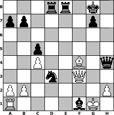 Partie-Notation im PGN-Format [Event "Der Beste hinter den 1900ern(3/10) oder 10 hoch 2"] [Site "www.mySchach.de"] [Date "2010.01.12"] [Round "1"] [White "Juliette2103"] [Black "Kloetzchenschieber"] [ECO "B00"] [WhitemyELO "1475"] [BlackmyELO "1734"] [Result "0-1"] [TimeControl "10/864000"] [WhiteDays "02"] [BlackDays "10"] [MySchachNr "62341"] 1. e4 Nc6 2. Nc3 Nf6 3. Nf3 e5 4. Bc4 Nxe4 5. Bxf7+ Kxf7 6. Nxe4 d5 7. Ng3 e4 8. Ng1 h5 9. d3 Bg4 10. f3 exf3 11. Nxf3 Bb4+ 12. c3 Re8+ 13. Kf2 Bd6 14. Rf1 Kg8 15. Kg1 h4 16. Ne2 Ne5 17. Ned4 c5 18. Nb5 h3 19. Nxd6 hxg2 20. Kxg2 Qxd6 21. Bf4 Qg6 22. Nh4 Qh5 23. Qb3 Qxh4 24. Qxd5+ Be6 25. Qe4 Rad8 26. c4 Nxd3 27. Qf3 Bh3+ 28. Kg1 Bxf1 0-1 Stellungs-Notation im FEN-Format 3rr1k1/pp4p1/8/2p5/2P2B1q/3n1Q2/PP5P/R4bK1 - - - 0 29 Geschlagene Figuren Weiss: Geschlagene Figuren Schwarz: Klicken Sie auf eine geschlagene Figur um den gewünschten Zug darzustellen!