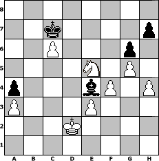 Partie-Notation im PGN-Format [Event "Schach dem "Nikolaus II""] [Site "www.mySchach.de"] [Date "2010.11.13"] [Round "1"] [White "sprinterde"] [Black "Ziegert"] [ECO "A40"] [WhitemyELO "1600"] [BlackmyELO "1521"] [Result "1-0"] [TimeControl "10/2592000"] [WhiteDays "150"] [BlackDays "094"] [MySchachNr "69807"] 1. d4 e6 2. c4 d5 3. Nc3 Nf6 4. Bg5 Be7 5. e3 O-O 6. Qb3 c6 7. Nf3 b6 8. h3 Bb7 9. Rc1 Nbd7 10. cxd5 exd5 11. Bd3 Ne4 12. Bxe7 Qxe7 13. Bxe4 dxe4 14. Nd2 Nf6 15. O-O Rfd8 16. Rfd1 Nd5 17. Ncxe4 Rac8 18. Ng3 Qg5 19. Nf3 Qf6 20. Rd2 Ne7 21. Ne4 Qg6 22. Ne5 Qf5 23. Nc5 Ba8 24. g4 Qf6 25. Ne4 Qe6 26. Qxe6 fxe6 27. Ng5 Rd6 28. Nc4 Rd5 29. Nxe6 Kf7 30. Nf4 Rdd8 31. Ne5+ Kg8 32. h4 c5 33. Rdc2 Be4 34. Rc3 Nd5 35. Nxd5 Rxd5 36. f4 Kf8 37. b4 Ke7 38. bxc5 bxc5 39. Rxc5 Rdxc5 40. Rxc5 Rxc5 41. dxc5 Ke6 42. Kf2 a5 43. c6 Kd6 44. a3 g6 45. g5 a4 46. Ke2 Kc7 47. Kd2 1-0 Stellungs-Notation im FEN-Format 8/2k4p/2P3p1/4N1P1/p3bP1P/P3P3/3K4/8 - - - 3 47 Geschlagene Figuren Weiss: Geschlagene Figuren Schwarz: Klicken Sie auf eine geschlagene Figur um den gewünschten Zug darzustellen!