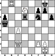 Partie-Notation im PGN-Format [Event "Sommer"] [Site "www.mySchach.de"] [Date "2015.07.14"] [Round "1"] [White "Joschi"] [Black "Winston"] [ECO "B28"] [WhitemyELO "1563"] [BlackmyELO "1441"] [Result "1-0"] [TimeControl "10/1728000"] [WhiteDays "100"] [BlackDays "096"] [MySchachNr "99664"] 1. e4 c5 2. Nf3 a6 3. d4 e6 4. Nc3 h6 5. Bf4 Nc6 6. Be2 Nge7 7. Bd6 Ng6 8. dxc5 b6 9. Bxf8 Nxf8 10. cxb6 Qxb6 11. Rb1 Ng6 12. O-O O-O 13. Re1 Qb8 14. Na4 Qb4 15. Nc3 Qe7 16. a3 e5 17. Bc4 Rb8 18. Qd2 Bb7 19. Red1 Rfd8 20. Nd5 Qc5 21. Bb3 Nce7 22. h3 Bc6 23. Ba2 Ba4 24. b3 Nxd5 25. exd5 Qxa3 26. bxa4 Qxa2 27. Ra1 Qc4 28. d6 Qc6 29. h4 Re8 30. h5 Nf4 31. Re1 Re6 32. Rad1 Nxh5 33. Nxe5 Qxa4 34. c4 Rb3 35. Ra1 Ra3 36. Rxa3 Qxa3 37. Nxd7 Rxd6 38. Re8+ Kh7 39. Nf8+ Kg8 40. Qc2 Nf6 41. Rb8 Qa5 42. Nd7+ 1-0 Stellungs-Notation im FEN-Format 1R4k1/3N1pp1/p2r1n1p/q7/2P5/8/2Q2PP1/6K1 - - - 9 42 Geschlagene Figuren Weiss: Geschlagene Figuren Schwarz: Klicken Sie auf eine geschlagene Figur um den gewünschten Zug darzustellen!