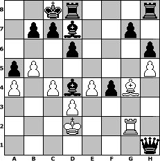Partie-Notation im PGN-Format [Event "Energiekrise"] [Site "www.mySchach.de"] [Date "2022.10.29"] [Round "1"] [White "Andreas1954"] [Black "wolni55"] [ECO "C20"] [WhitemyELO "1333"] [BlackmyELO "1512"] [Result "0-1"] [TimeControl "10/1728000"] [WhiteDays "20"] [BlackDays "19"] [MySchachNr "127788"] 1. e4 e5 2. d3 Bc5 3. Nf3 d6 4. Bd2 Nf6 5. Bg5 h6 6. Bxf6 Qxf6 7. a3 Nc6 8. b4 Bb6 9. c3 Qg6 10. b5 Na5 11. a4 Be6 12. c4 f5 13. Nh4 Qg5 14. g3 f4 15. Ng2 Bg4 16. f3 Bd7 17. gxf4 exf4 18. h4 Qf6 19. Ra2 Bd4 20. Qd2 Be5 21. h5 Nb3 22. Qc2 Nd4 23. Qd1 Qg5 24. Rh4 Qg3+ 25. Kd2 Nxf3+ 26. Kc2 Nxh4 27. Nxh4 Qxh4 28. Kb3 Bd4 29. Be2 a6 30. Bf3 a5 31. Rg2 Qf6 32. Qh1 O-O-O 33. Re2 Qe5 34. Rg2 Qc5 35. Bg4 Qb4+ 36. Kc2 Qb2+ 37. Kd1 Qxb1+ 38. Kd2 Qxh1 0-1 Stellungs-Notation im FEN-Format 2kr3r/1ppb2p1/3p3p/pP5P/P1PbPpB1/3P4/3K2R1/7q - - - 0 39 Geschlagene Figuren Weiss: Geschlagene Figuren Schwarz: Klicken Sie auf eine geschlagene Figur um den gewünschten Zug darzustellen!