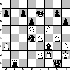 Partie-Notation im PGN-Format [Event "Turnier zum Tag der deutschen Einheit"] [Site "www.mySchach.de"] [Date "2010.10.04"] [Round "2"] [White "Hobbykegler"] [Black "wiesel"] [ECO "C47"] [WhitemyELO "1133"] [BlackmyELO "1335"] [Result "0-1"] [TimeControl "10/1728000"] [WhiteDays "44"] [BlackDays "73"] [MySchachNr "68785"] 1. e4 e5 2. Nf3 Nc6 3. Nc3 Nf6 4. Bc4 Bc5 5. O-O O-O 6. d3 Re8 7. Ng5 h6 8. Nxf7 Qe7 9. Nd6+ Kf8 10. Nxe8 Qxe8 11. Nd5 Nxd5 12. Bxd5 Nd4 13. Be3 d6 14. c3 Ne6 15. Qf3+ Ke7 16. Bxc5 Nxc5 17. b4 Ne6 18. d4 exd4 19. cxd4 Nxd4 20. Qg4 Bxg4 21. f4 Qg6 22. Bxb7 Rb8 23. Bd5 Rxb4 24. f5 Qg5 25. Rad1 Bf3 26. Rf2 Bxd1 27. a3 Rb1 28. h3 Bf3+ 29. Kh2 Qf4+ 30. g3 Qc1 31. g4 Qg1# 0-1 Stellungs-Notation im FEN-Format 8/p1p1k1p1/3p3p/3B1P2/3nP1P1/P4b1P/4PR1K/1r4q1 - - - 1 32 Geschlagene Figuren Weiss: Geschlagene Figuren Schwarz: Klicken Sie auf eine geschlagene Figur um den gewünschten Zug darzustellen!