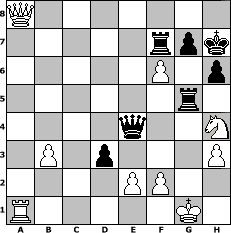 Partie-Notation im PGN-Format [Event "Es wird bald Sommer"] [Site "www.mySchach.de"] [Date "2015.05.12"] [Round "2"] [White "Schefsche"] [Black "muellerh"] [ECO "B20"] [WhitemyELO "1452"] [BlackmyELO "1522"] [Result "0-1"] [TimeControl "10/2592000"] [WhiteDays "30"] [BlackDays "21"] [MySchachNr "99225"] 1. e4 c5 2. Bc4 e5 3. d3 Nf6 4. Bg5 Be7 5. Bxf6 Bxf6 6. Nf3 O-O 7. Nc3 Nc6 8. Qd2 Rb8 9. a4 a6 10. Nd5 b5 11. Bb3 h6 12. axb5 axb5 13. c3 Bb7 14. Nxf6+ Qxf6 15. O-O Ne7 16. Rfe1 Rfd8 17. d4 exd4 18. cxd4 c4 19. Bc2 d6 20. b3 d5 21. e5 Qe6 22. h3 Bc6 23. Qb4 Ng6 24. Ra6 Ne7 25. Rea1 f6 26. g4 fxe5 27. dxe5 d4 28. Bf5 Nxf5 29. gxf5 Qe8 30. Nh4 Bb7 31. R6a5 Qxe5 32. Rxb5 Qe4 33. Qxc4+ Kh7 34. Rxb7 Rxb7 35. Qa6 d3 36. f6 Rf7 37. Qa5 Rd5 38. Qa8 Rg5+ 0-1 Stellungs-Notation im FEN-Format Q7/5rpk/5P1p/6r1/4q2N/1P1p3P/4PP2/R5K1 - - - 5 39 Geschlagene Figuren Weiss: Geschlagene Figuren Schwarz: Klicken Sie auf eine geschlagene Figur um den gewünschten Zug darzustellen!