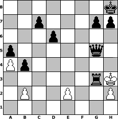 Partie-Notation im PGN-Format [Event "unter uns Nr. 17"] [Site "www.mySchach.de"] [Date "2014.02.13"] [Round "1"] [White "Haneken"] [Black "Schefsche"] [ECO "C45"] [WhitemyELO "1030"] [BlackmyELO "1427"] [Result "0-1"] [TimeControl "10/864000"] [WhiteDays "29"] [BlackDays "29"] [MySchachNr "92906"] 1. e4 e5 2. Nf3 Nc6 3. d4 exd4 4. Nxd4 Nxd4 5. Qxd4 b6 6. Bb5 a6 7. Ba4 Qf6 8. e5 Qg6 9. O-O b5 10. Bb3 Bb7 11. f3 Qc6 12. Be3 Ne7 13. Rd1 Nf5 14. Qd3 Nxe3 15. Qxe3 Bc5 16. Rd4 Bxd4 17. Qxd4 O-O 18. Qf4 a5 19. a4 b4 20. Qd4 Rad8 21. Nd2 d6 22. e6 fxe6 23. Bxe6+ Kh8 24. Ne4 Qxc2 25. Ng5 Rde8 26. Qh4 Bxf3 27. gxf3 Qg6 28. Re1 Rxf3 29. Bf7 Rxe1+ 30. Kg2 Rxf7 31. Qxe1 Qxg5+ 32. Kh3 Rf3+ 33. Qg3 Rxg3+ 0-1 Stellungs-Notation im FEN-Format 7k/2p3pp/3p4/p5q1/Pp6/6rK/1P2P2P/8 - - - 0 34 Geschlagene Figuren Weiss: Geschlagene Figuren Schwarz: Klicken Sie auf eine geschlagene Figur um den gewünschten Zug darzustellen!