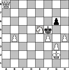 Partie-Notation im PGN-Format [Event "Thema-2016-01"] [Site "www.mySchach.de"] [Date "2016.02.11"] [Round "1"] [White "Seneca"] [Black "Achimkogge"] [ECO "A12"] [WhitemyELO "1480"] [BlackmyELO "1424"] [Result "1-0"] [TimeControl "10/2592000"] [WhiteDays "30"] [BlackDays "30"] [MySchachNr "102481"] 1. c4 c6 2. Nf3 d5 3. b3 d4 4. Bb2 c5 5. d3 Qa5+ 6. Qd2 Qc7 7. e3 e5 8. e4 f6 9. Be2 Bg4 10. h3 Bh5 11. O-O a5 12. a4 Nc6 13. Ba3 Be7 14. Qd1 b6 15. Nxd4 Bxe2 16. Nxe2 Nh6 17. Nbc3 Nb4 18. Nd5 Nxd5 19. cxd5 O-O 20. Ng3 g6 21. Bc1 Nf7 22. Be3 Rfd8 23. Rc1 Rdb8 24. Qg4 Kh8 25. d4 Bd6 26. Qf3 Qe7 27. dxc5 bxc5 28. Rc3 Rf8 29. Rc1 Ng5 30. Qe2 Qd7 31. Qd2 h6 32. h4 Nf7 33. Bxh6 Rg8 34. Nf1 Kh7 35. Be3 Qg4 36. g3 Qxe4 37. Bxc5 Rgc8 38. Bxd6 Nxd6 39. Rc7+ Rxc7 40. Rxc7+ Kg8 41. Ne3 Nf7 42. Kh2 Qd4 43. Qc2 Kg7 44. Rc4 Qb6 45. Rc5 Qd8 46. Qc3 Qh8 47. Rxa5 Rc8 48. Rc5 Nd6 49. Rxc8 Nxc8 50. b4 Nd6 51. Qc7+ Nf7 52. a5 Qa8 53. d6 Qf3 54. Kg1 Qa8 55. Nc4 Qd5 56. Qc5 Qa8 57. Nb6 Qg8 58. d7 Nd8 59. Qe7+ Kh6 60. Qxf6 e4 61. Qg5+ Kg7 62. Qe5+ Kh6 63. Qxe4 Ne6 64. Qd5 Qf7 65. d8=Q Nxd8 66. Qxd8 Qg7 67. Qg5+ Kh7 68. Kg2 Qb7+ 69. Qd5 Qc7 70. Qd7+ Qxd7 71. Nxd7 Kg7 72. a6 Kf7 73. a7 Ke7 74. Ne5 Kf6 75. f4 Kf5 76. a8=Q 1-0 Stellungs-Notation im FEN-Format Q7/8/6p1/4Nk2/1P3P1P/6P1/6K1/8 - - - 0 76 Geschlagene Figuren Weiss: Geschlagene Figuren Schwarz: Klicken Sie auf eine geschlagene Figur um den gewünschten Zug darzustellen!