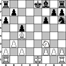 Partie-Notation im PGN-Format [Event "Anti Fritz8 Turnier"] [Site "www.mySchach.de"] [Date "2006.05.02"] [Round "1"] [White "Juri"] [Black "rikilatic"] [ECO "A01"] [WhitemyELO "1499"] [BlackmyELO "1617"] [Result "1-0"] [TimeControl "10/864000"] [WhiteDays "07"] [BlackDays "00"] [MySchachNr "25087"] 1. b3 e5 2. Bb2 d6 3. e4 Qf6 4. d4 Nh6 5. Nf3 exd4 6. Bxd4 Qf4 7. Bd3 Bg4 8. Nbd2 Bxf3 9. Qxf3 Qxf3 10. Nxf3 c5 11. Bb2 a6 12. Bc4 Nd7 13. e5 dxe5 14. Bxe5 Nxe5 15. Nxe5 f6 16. Nf3 1-0 Stellungs-Notation im FEN-Format r3kb1r/1p4pp/p4p1n/2p5/2B5/1P3N2/P1P2PPP/R3K2R - KQkq - 1 16 Geschlagene Figuren Weiss: Geschlagene Figuren Schwarz: Klicken Sie auf eine geschlagene Figur um den gewünschten Zug darzustellen!