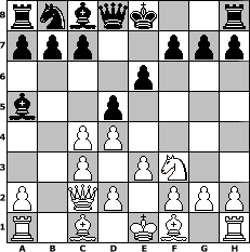 Partie-Notation im PGN-Format [Event "In Memorium Michael Knopf 2"] [Site "www.mySchach.de"] [Date "2013.04.10"] [Round "1"] [White "Teresa"] [Black "Master1"] [ECO "D31"] [WhitemyELO "1598"] [BlackmyELO "1220"] [Result "0-1"] [TimeControl "10/2592000"] [WhiteDays "27"] [BlackDays "25"] [MySchachNr "87722"] 1. d4 d5 2. c4 e6 3. Nc3 Bb4 4. e3 Nf6 5. Nf3 Ne4 6. Qc2 Nxc3 7. bxc3 Ba5 0-1 Stellungs-Notation im FEN-Format rnbqk2r/ppp2ppp/4p3/b2p4/2PP4/2P1PN2/P1QP1PPP/R1B1KB1R - KQkq - 1 8 Geschlagene Figuren Weiss: Geschlagene Figuren Schwarz: Klicken Sie auf eine geschlagene Figur um den gewünschten Zug darzustellen!