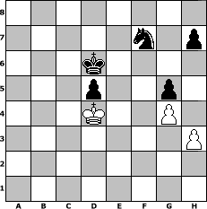 Partie-Notation im PGN-Format [Event "Einfach nur Schach 3"] [Site "www.mySchach.de"] [Date "2023.11.30"] [Round "1"] [White "faustballer"] [Black "Campino1986"] [ECO "A01"] [WhitemyELO "1481"] [BlackmyELO "1505"] [Result "0-1"] [TimeControl "10/864000"] [WhiteDays "60"] [BlackDays "45"] [MySchachNr "131174"] 1. b3 d5 2. d4 e6 3. Bb2 Nf6 4. Nf3 Nc6 5. a3 g6 6. e3 Bg7 7. Nbd2 O-O 8. Be2 Bd7 9. h3 Ne7 10. c4 c6 11. c5 b6 12. cxb6 axb6 13. Nh2 c5 14. O-O Nc6 15. Bf3 cxd4 16. exd4 Ne8 17. Nb1 Nd6 18. Ng4 Nb5 19. Ne5 Nxe5 20. dxe5 f6 21. a4 Na7 22. exf6 Bxf6 23. Bxf6 Qxf6 24. Nc3 Qxc3 25. Rc1 Qe5 26. Re1 Qd6 27. Re2 Rac8 28. Rb1 b5 29. Ra2 Rb8 30. Be2 bxa4 31. bxa4 Rxb1 32. Qxb1 Nc6 33. Bb5 Rb8 34. Rb2 Ne5 35. Bxd7 Rxb2 36. Bxe6+ Qxe6 37. Qxb2 Nc4 38. Qc3 Qa6 39. Qb3 Kg7 40. Qb5 Qxb5 41. axb5 Nb6 42. Kf1 Kf7 43. Ke2 Ke6 44. f4 Kd6 45. g4 Kc5 46. f5 g5 47. f6 Kxb5 48. Kd3 Kc5 49. Kd2 Nd7 50. f7 Kd6 51. Kd3 Ne5+ 52. Kd4 Nxf7 0-1 Stellungs-Notation im FEN-Format 8/5n1p/3k4/3p2p1/3K2P1/7P/8/8 - - - 0 53 Geschlagene Figuren Weiss: Geschlagene Figuren Schwarz: Klicken Sie auf eine geschlagene Figur um den gewünschten Zug darzustellen!