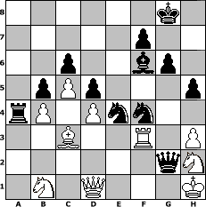 Partie-Notation im PGN-Format [Event "Sommersonne "] [Site "www.mySchach.de"] [Date "2016.05.14"] [Round "1"] [White "reisinger"] [Black "miu"] [ECO "E34"] [WhitemyELO "1515"] [BlackmyELO "1556"] [Result "0-1"] [TimeControl "10/2592000"] [WhiteDays "120"] [BlackDays "119"] [MySchachNr "103611"] 1. d4 Nf6 2. c4 e6 3. Nc3 Bb4 4. Qc2 d5 5. e3 O-O 6. a3 Be7 7. c5 c6 8. Bd3 b6 9. b4 Ba6 10. Nf3 Bxd3 11. Qxd3 b5 12. O-O Nbd7 13. a4 a6 14. axb5 axb5 15. Bb2 Qc7 16. h3 h6 17. Ra3 Rxa3 18. Bxa3 Nh7 19. Ra1 Ra8 20. Qf1 e5 21. Nh2 exd4 22. exd4 Bf6 23. Qd1 g6 24. Nf3 Ng5 25. Nh2 h5 26. Ra2 Nf8 27. Nb1 Nfe6 28. Rd2 Qf4 29. Bb2 Ra4 30. Bc3 Ne4 31. Rd3 Qxf2+ 32. Kh1 Nf4 33. Rf3 Qxg2# 0-1 Stellungs-Notation im FEN-Format 6k1/5p2/2p2bp1/1pPp3p/rP1Pnn2/2B2R1P/6qN/1N1Q3K - - - 0 34 Geschlagene Figuren Weiss: Geschlagene Figuren Schwarz: Klicken Sie auf eine geschlagene Figur um den gewünschten Zug darzustellen!