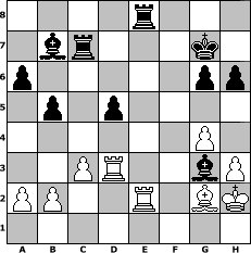 Partie-Notation im PGN-Format [Event "Pfingsturnier"] [Site "www.mySchach.de"] [Date "2019.05.31"] [Round "2"] [White "Grubengeist"] [Black "Erich"] [ECO "B90"] [WhitemyELO "2044"] [BlackmyELO "2072"] [Result "0-1"] [TimeControl "10/2592000"] [WhiteDays "089"] [BlackDays "111"] [MySchachNr "115127"] 1. e4 c5 2. Nf3 d6 3. d4 cxd4 4. Nxd4 Nf6 5. Nc3 a6 6. h3 e6 7. g4 h6 8. Bg2 Be7 9. Be3 Nc6 10. f4 Nd7 11. O-O Nxd4 12. Qxd4 O-O 13. Qd2 Rb8 14. Rad1 b5 15. Ne2 Bb7 16. Ng3 Qc7 17. Nh5 g6 18. Ng3 Rbc8 19. c3 Nb6 20. Bf2 Nc4 21. Qe2 Kh7 22. Kh2 Nb6 23. Rd2 Bh4 24. Rfd1 d5 25. Bxb6 Qxb6 26. exd5 exd5 27. Qf2 Qxf2 28. Rxf2 Rfe8 29. f5 Rc7 30. fxg6+ fxg6 31. Rd3 Kg7 32. Re2 Bxg3+ 0-1 Stellungs-Notation im FEN-Format 4r3/1br3k1/p5pp/1p1p4/6P1/2PR2bP/PP2R1BK/8 - - - 0 33 Geschlagene Figuren Weiss: Geschlagene Figuren Schwarz: Klicken Sie auf eine geschlagene Figur um den gewünschten Zug darzustellen!