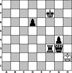 Partie-Notation im PGN-Format [Event "Turnier in den M"] [Site "www.mySchach.de"] [Date "2014.02.19"] [Round "1"] [White "augustus"] [Black "Achimkogge"] [ECO "C24"] [WhitemyELO "1341"] [BlackmyELO "1436"] [Result "0-1"] [TimeControl "10/2592000"] [WhiteDays "00"] [BlackDays "25"] [MySchachNr "93097"] 1. e4 e5 2. Bc4 Nf6 3. d3 h6 4. Nf3 Nc6 5. c3 a6 6. Nh4 g6 7. Qb3 Qe7 8. O-O Na5 9. Bxf7+ Qxf7 10. Qxf7+ Kxf7 11. f4 Bc5+ 12. Kh1 Nc6 13. f5 g5 14. Ng6 Rg8 15. b4 Ba7 16. a3 Ng4 17. Bb2 Ne3 18. Rf3 Ng4 19. h3 Nf6 20. g4 b5 21. Nd2 d6 22. Rg3 Bf2 23. Rf3 Bb6 24. Rg1 Bxg1 25. Kxg1 h5 26. gxh5 Nxh5 27. c4 bxc4 28. Nxc4 Rb8 29. Kf2 a5 30. Bc3 axb4 31. Bxb4 Nxb4 32. axb4 Rxb4 33. Ke3 Ba6 34. Na5 Kf6 35. Nc6 Rb3 36. Kd2 Rxd3+ 37. Rxd3 Bxd3 38. Kxd3 Nf4+ 39. Ke3 Nxh3 40. Nce7 Ra8 41. Nd5+ Kg7 42. Nxc7 Rc8 43. Nd5 g4 44. Nh4 Ng5 45. f6+ Kf7 46. Nf5 Rc4 47. Ng3 Ke6 48. Ke2 Nxe4 49. Nxe4 Rxe4+ 50. Kd3 Rd4+ 51. Ke3 Rxd5 52. f7 Kxf7 53. Kf2 Rd3 54. Kg2 e4 55. Kf1 Rf3+ 56. Kg2 e3 57. Kg1 e2 58. Kg2 e1=Q 59. Kh2 Qg3+ 0-1 Stellungs-Notation im FEN-Format 8/5k2/3p4/8/6p1/5rq1/7K/8 - - - 2 60 Geschlagene Figuren Weiss: Geschlagene Figuren Schwarz: Klicken Sie auf eine geschlagene Figur um den gewünschten Zug darzustellen!