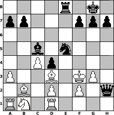 Partie-Notation im PGN-Format [Event "Bobby Fischer Ged"] [Site "www.mySchach.de"] [Date "2008.02.01"] [Round "1"] [White "nogumo"] [Black "Koprek"] [ECO "A00"] [WhitemyELO "1681"] [BlackmyELO "1755"] [Result "0-1"] [TimeControl "10/864000"] [WhiteDays "21"] [BlackDays "27"] [MySchachNr "42170"] 1. b4 c5 2. bxc5 e5 3. Bb2 Nc6 4. e3 Bxc5 5. Nf3 Qe7 6. Be2 d5 7. O-O Nf6 8. c4 d4 9. exd4 exd4 10. Bd3 O-O 11. Re1 Qd6 12. a3 Bg4 13. h3 Bxf3 14. Qxf3 Rfe8 15. Rd1 Ne5 16. Qe2 Neg4 17. Qxe8+ Rxe8 18. hxg4 Nxg4 19. g3 Qh6 20. Kg2 Qh2+ 21. Kf3 Ne5+ 0-1 Stellungs-Notation im FEN-Format 4r1k1/pp3ppp/8/2b1n3/2Pp4/P2B1KP1/1B1P1P1q/RN1R4 - - - 5 22 Geschlagene Figuren Weiss: Geschlagene Figuren Schwarz: Klicken Sie auf eine geschlagene Figur um den gewünschten Zug darzustellen!