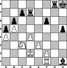 Partie-Notation im PGN-Format [Event "Bremer Schl"] [Site "www.mySchach.de"] [Date "2010.04.10"] [Round "1"] [White "larlinde"] [Black "Baehr008"] [ECO "E10"] [WhitemyELO "2177"] [BlackmyELO "2090"] [Result "0-1"] [TimeControl "10/3456000"] [WhiteDays "097"] [BlackDays "159"] [MySchachNr "64727"] 1. d4 Nf6 2. c4 e6 3. Nf3 d5 4. Nc3 Be7 5. Bf4 Nc6 6. e3 O-O 7. a3 Nh5 8. Be5 g6 9. Be2 f6 10. Bg3 Na5 11. cxd5 exd5 12. b4 Nc6 13. Ng1 Nxg3 14. hxg3 Be6 15. Nh3 Bd6 16. Nf4 Bxf4 17. gxf4 a5 18. b5 Ne7 19. Na4 b6 20. g4 Qd6 21. Nc3 Kh8 22. Bd3 Qd7 23. f5 gxf5 24. Qf3 Rf7 25. gxf5 Nxf5 26. Rg1 Re8 27. Bxf5 Bxf5 28. Qxd5 h5 29. Rh1 Bg4 30. Kd2 Rg8 31. Qxd7 Rxd7 32. Raf1 Bf3 33. a4 Bxh1 0-1 Stellungs-Notation im FEN-Format 6rk/2pr4/1p3p2/pP5p/P2P4/2N1P3/3K1P2/5R1b - - - 0 34 Geschlagene Figuren Weiss: Geschlagene Figuren Schwarz: Klicken Sie auf eine geschlagene Figur um den gewünschten Zug darzustellen!