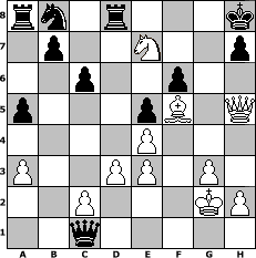 Partie-Notation im PGN-Format [Event "7erD2"] [Site "www.mySchach.de"] [Date "2011.10.14"] [Round "1"] [White "Duschgel"] [Black "sprinterde"] [ECO "A15"] [WhitemyELO "1645"] [BlackmyELO "1678"] [Result "1-0"] [TimeControl "10/3456000"] [WhiteDays "40"] [BlackDays "40"] [MySchachNr "76783"] 1. c4 Nf6 2. g3 e5 3. Bg2 Bc5 4. e3 c6 5. Ne2 O-O 6. a3 a5 7. Nbc3 d5 8. cxd5 Nxd5 9. O-O Nxc3 10. Nxc3 Bf5 11. e4 Bg6 12. d3 Bd4 13. Be3 Bxe3 14. fxe3 Qb6 15. Qe2 Rd8 16. Rad1 f6 17. Bh3 Bf7 18. Qg4 Qxb2 19. Rxf6 Bb3 20. Nd5 Bxd1 21. Ne7+ Kh8 22. Qh4 Bh5 23. Qxh5 gxf6 24. Bf5 Qc1+ 25. Kg2 1-0 Stellungs-Notation im FEN-Format rn1r3k/1p2N2p/2p2p2/p3pB1Q/4P3/P2PP1P1/2P3KP/2q5 - - - 3 25 Geschlagene Figuren Weiss: Geschlagene Figuren Schwarz: Klicken Sie auf eine geschlagene Figur um den gewünschten Zug darzustellen!