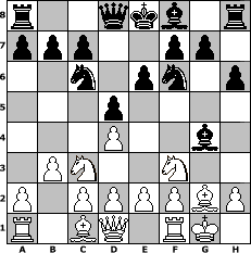 Partie-Notation im PGN-Format [Event "Spa"] [Site "www.mySchach.de"] [Date "2009.07.08"] [Round "1"] [White "Knight"] [Black "scherry"] [ECO "A45"] [WhitemyELO "1168"] [BlackmyELO "1262"] [Result "1-0"] [TimeControl "10/2592000"] [WhiteDays "29"] [BlackDays "00"] [MySchachNr "57259"] 1. d4 Nf6 2. g4 h6 3. Nc3 d5 4. Bg2 Bxg4 5. Nf3 Nc6 6. O-O e6 7. b3 1-0 Stellungs-Notation im FEN-Format r2qkb1r/ppp2pp1/2n1pn1p/3p4/3P2b1/1PN2N2/P1PPPPBP/R1BQ1RK1 - kq - 0 7 Geschlagene Figuren Weiss: Geschlagene Figuren Schwarz: Klicken Sie auf eine geschlagene Figur um den gewünschten Zug darzustellen!