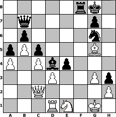 Partie-Notation im PGN-Format [Event "1. Chess960/6"] [Site "www.mySchach.de"] [Date "2007.03.01"] [Round "1"] [White "Ostseeboy"] [Black "Offi@ (adv.)"] [Variant "Fischerrandom"] [SetUp "1"] [FEN "rbqkbrnn/pppppppp/8/8/8/8/PPPPPPPP/RBQKBRNN w KQkq - 0 1"] [WhitemyELO "1500"] [BlackmyELO "1500"] [Result "0-1"] [TimeControl "10/3456000"] [WhiteDays "117"] [BlackDays "117"] [MySchachNr "33165"] 1. c4 Nf6 2. Nf3 c5 3. Ng3 Ng6 4. a3 d5 5. d3 d4 6. Bd2 Bc6 7. O-O O-O 8. b3 h5 9. b4 h4 10. Ne4 Nxe4 11. dxe4 h3 12. g3 b6 13. b5 Bb7 14. a4 a5 15. Bd3 Qg4 16. Be1 Bxe4 17. Bxe4 Qxe4 18. Qd2 f5 19. Qd3 Qb7 20. Bd2 e5 21. Ne1 e4 22. Qc2 f4 23. Rd1 fxg3 24. fxg3 Rxf1+ 25. Kxf1 Be5 26. Bg5 Rf8+ 27. Kg1 d3 28. exd3 Bd4+ 0-1 Stellungs-Notation im FEN-Format 5rk1/1q4p1/1p4n1/pPp3B1/P1Pbp3/3P2Pp/2Q4P/3RN1K1 - - - 1 29 Geschlagene Figuren Weiss: Geschlagene Figuren Schwarz: Klicken Sie auf eine geschlagene Figur um den gewünschten Zug darzustellen!