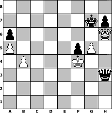 Partie-Notation im PGN-Format [Event "R"] [Site "www.mySchach.de"] [Date "2005.07.20"] [Round "1"] [White "bane"] [Black "Juliette2103"] [ECO "A40"] [WhitemyELO "1866"] [BlackmyELO "1979"] [Result "1-0"] [TimeControl "10/2592000"] [WhiteDays "240"] [BlackDays "237"] [MySchachNr "15259"] 1. d4 g6 2. e4 d6 3. Bb5+ c6 4. Ba4 Nf6 5. Nd2 Bg7 6. Ngf3 Qa5 7. c3 Nbd7 8. b4 Qh5 9. Bb3 O-O 10. O-O b6 11. Re1 Ba6 12. h3 e5 13. Nf1 Bxf1 14. Kxf1 Rae8 15. d5 c5 16. Ba4 Re7 17. Qd2 Rc8 18. Bd1 cxb4 19. cxb4 b5 20. Qd3 Nb6 21. Qxb5 Ne8 22. Qa6 Rec7 23. Nd4 Qh4 24. Nc6 Nf6 25. Bf3 Ra8 26. Be3 Nc8 27. Qa5 Rd7 28. Bd2 Bh6 29. Bxh6 Qxh6 30. Qa3 Qh4 31. Qe3 Nb6 32. Rec1 Rb7 33. Rc2 Ne8 34. a4 a6 35. a5 Nd7 36. Kg1 f5 37. Rac1 Ndf6 38. Rc4 fxe4 39. Bxe4 Nxe4 40. Rxe4 Qh5 41. g4 Qh4 42. g5 Qh5 43. f4 Rf7 44. Qg3 Rxf4 45. Rxf4 exf4 46. Qxf4 Ng7 47. Ne7+ Kh8 48. Rf1 Nf5 49. Nxf5 gxf5 50. Kh2 Rf8 51. Re1 Qg6 52. Re6 Qg7 53. Rxd6 Qb2+ 54. Kg3 Qc3+ 55. Kf2 Qc2+ 56. Ke1 Qb1+ 57. Ke2 Re8+ 58. Re6 Rxe6+ 59. dxe6 Qa2+ 60. Qd2 Qxe6+ 61. Kf2 Qe4 62. Qd8+ Kg7 63. Qc7+ Kg6 64. Qb6+ Kf7 65. Qf6+ Kg8 66. Qc3 Qf4+ 67. Kg2 Kf7 68. Qf6+ Kg8 69. Qe7 Qd2+ 70. Kf3 Qd3+ 71. Kf4 Qxh3 72. Qe6+ Kg7 73. Qh6+ 1-0 Stellungs-Notation im FEN-Format 8/6kp/p6Q/P4pP1/1P3K2/7q/8/8 - - - 3 73 Geschlagene Figuren Weiss: Geschlagene Figuren Schwarz: Klicken Sie auf eine geschlagene Figur um den gewünschten Zug darzustellen!