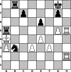 Partie-Notation im PGN-Format [Event "LISA OPEN #2"] [Site "www.mySchach.de"] [Date "2017.10.26"] [Round "1"] [White "wolni55"] [Black "Erich"] [ECO "C55"] [WhitemyELO "1396"] [BlackmyELO "2127"] [Result "0-1"] [TimeControl "10/3456000"] [WhiteDays "40"] [BlackDays "40"] [MySchachNr "110150"] 1. e4 e5 2. Nf3 Nc6 3. Bc4 Nf6 4. d3 Be7 5. a3 d6 6. h3 Be6 7. Bxe6 fxe6 8. c3 a5 9. Qb3 Qd7 10. Qxb7 Rb8 11. Qa6 O-O 12. Qc4 d5 13. Qa4 Nd4 14. Qxd7 Nxf3+ 15. gxf3 Nxd7 16. Ke2 a4 17. h4 h5 18. Bg5 Rxb2+ 19. Ke3 Bxg5+ 20. hxg5 d4+ 21. cxd4 exd4+ 22. Kxd4 Rxf2 23. Rh3 Rf1 24. Kc3 Nc5 25. Kc4 Nb3 26. Ra2 Rxb1 27. Rxh5 Rc1+ 28. Kb4 Rb8+ 29. Kxa4 Rc5 30. Rah2 Ra5# 0-1 Stellungs-Notation im FEN-Format 1r4k1/2p3p1/4p3/r5PR/K3P3/Pn1P1P2/7R/8 - - - 3 31 Geschlagene Figuren Weiss: Geschlagene Figuren Schwarz: Klicken Sie auf eine geschlagene Figur um den gewünschten Zug darzustellen!