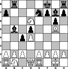 Partie-Notation im PGN-Format [Event "Februar 2018"] [Site "www.mySchach.de"] [Date "2018.02.03"] [Round "1"] [White "muellerh"] [Black "Knight"] [ECO "B30"] [WhitemyELO "1479"] [BlackmyELO "1091"] [Result "1-0"] [TimeControl "10/1728000"] [WhiteDays "29"] [BlackDays "40"] [MySchachNr "111271"] 1. e4 c5 2. Nf3 Nc6 3. Bc4 e6 4. O-O Nge7 5. d4 d5 6. exd5 exd5 7. Bb5 g6 8. Bg5 c4 9. Ne5 Bg7 10. Nxc6 Bd7 11. Nxd8 Bxb5 12. Nxb7 Rb8 13. Nd6+ Kf8 14. Re1 1-0 Stellungs-Notation im FEN-Format 1r3k1r/p3npbp/3N2p1/1b1p2B1/2pP4/8/PPP1PPPP/RN1QR1K1 - - - 4 14 Geschlagene Figuren Weiss: Geschlagene Figuren Schwarz: Klicken Sie auf eine geschlagene Figur um den gewünschten Zug darzustellen!