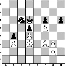 Partie-Notation im PGN-Format [Event "F"] [Site "www.mySchach.de"] [Date "2006.05.06"] [Round "2"] [White "hermtz"] [Black "nogumo"] [ECO "A46"] [WhitemyELO "1755"] [BlackmyELO "1816"] [Result "1/2-1/2"] [TimeControl "10/1728000"] [WhiteDays "20"] [BlackDays "20"] [MySchachNr "25226"] 1. d4 Nf6 2. Nf3 c5 3. c3 cxd4 4. cxd4 g6 5. Bf4 Bg7 6. e3 O-O 7. Bd3 Nd5 8. Bg3 Qa5+ 9. Qd2 Qxd2+ 10. Nbxd2 Nb4 11. Bb1 b6 12. a3 N4c6 13. O-O d6 14. Ba2 Nd7 15. Rac1 Bb7 16. Bd5 Rac8 17. Ng5 h6 18. Ngf3 Nf6 19. Ba2 a5 20. Nc4 b5 21. Ncd2 Na7 22. Nh4 Nh5 23. Nxg6 Rfe8 24. Rxc8 Nxc8 25. Rc1 Kh7 26. Nh4 Nxg3 27. hxg3 d5 28. Nf5 e6 29. Nxg7 Kxg7 30. Rc7 Re7 31. Rxe7 Nxe7 32. Nb3 Nc6 33. Nc5 Bc8 34. Kf1 b4 35. Bb3 Kf6 36. Ba4 Nb8 37. axb4 axb4 38. b3 Ba6+ 39. Ke1 Ke7 40. Kd2 Kd6 41. Be8 Ke7 42. Ba4 Kd6 43. Nd3 Bxd3 44. Kxd3 Nc6 45. f3 Ne7 46. e4 f6 47. Be8 Nc8 48. f4 Ke7 49. Bh5 Na7 50. exd5 exd5 51. Bf3 Kd6 52. f5 Nc6 1/2-1/2 Stellungs-Notation im FEN-Format 8/8/2nk1p1p/3p1P2/1p1P4/1P1K1BP1/6P1/8 - - - 1 53 Geschlagene Figuren Weiss: Geschlagene Figuren Schwarz: Klicken Sie auf eine geschlagene Figur um den gewünschten Zug darzustellen!