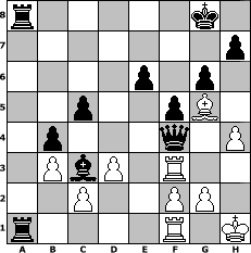 Partie-Notation im PGN-Format [Event "Fernschachmeisterschaft Sfr. Heimersheim 2007"] [Site "www.mySchach.de"] [Date "2007.01.21"] [Round "2"] [White "Ralphi@"] [Black "MisterBean"] [ECO "A03"] [WhitemyELO "1500"] [BlackmyELO "1786"] [Result "1/2-1/2"] [TimeControl "10/2592000"] [WhiteDays "30"] [BlackDays "30"] [MySchachNr "31885"] 1. f4 d5 2. Nf3 g6 3. d3 Nf6 4. e3 Bg7 5. Be2 O-O 6. O-O b6 7. Nc3 Bb7 8. Ne5 Nbd7 9. Bf3 c5 10. Bd2 a6 11. Qe2 Qc7 12. a4 Nxe5 13. fxe5 Qxe5 14. Rae1 Qc7 15. e4 dxe4 16. Nxe4 Nxe4 17. Bxe4 Bxe4 18. Qxe4 e6 19. b3 Rad8 20. Rf3 b5 21. axb5 axb5 22. Bf4 Qd7 23. Kh1 Qd5 24. Qe2 b4 25. Rf1 Ra8 26. Be3 f5 27. Rh3 Bd4 28. Bg5 Ra6 29. Rg3 Rfa8 30. h4 Ra1 31. Rf3 Qe5 32. Qd2 Bc3 33. Qf4 Qxf4 1/2-1/2 Stellungs-Notation im FEN-Format r5k1/7p/4p1p1/2p2pB1/1p3q1P/1PbP1R2/2P2PP1/r4R1K - - - 0 34 Geschlagene Figuren Weiss: ![]() ![]() ![]() ![]() ![]() ![]() ![]() ![]() ![]() ![]() ![]() ![]() ![]() ![]() ![]() Geschlagene Figuren Schwarz: ![]() ![]() ![]() ![]() ![]() ![]() ![]() ![]() ![]() ![]() ![]() ![]() ![]() ![]() ![]() Klicken Sie auf eine geschlagene Figur um den gewünschten Zug darzustellen!