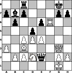 Partie-Notation im PGN-Format [Event "Sommerschach 2009"] [Site "www.mySchach.de"] [Date "2009.06.09"] [Round "1"] [White "muellerh"] [Black "murphy12"] [ECO "A13"] [WhitemyELO "1565"] [BlackmyELO "1636"] [Result "1-0"] [TimeControl "10/864000"] [WhiteDays "10"] [BlackDays "10"] [MySchachNr "56465"] 1. c4 e6 2. d4 Nf6 3. Nc3 Bb4 4. Bd2 O-O 5. Nf3 b6 6. a3 Bxc3 7. Bxc3 Bb7 8. e3 Ne4 9. Bd3 f5 10. Bxe4 fxe4 11. Nd2 Qf6 12. O-O d5 13. Rc1 Nd7 14. Qg4 Qf5 15. Qg3 Rac8 16. f3 exf3 17. Rxf3 Qd3 18. Rcf1 Rxf3 19. Rxf3 Nf6 20. e4 Qe2 21. Rxf6 1-0 Stellungs-Notation im FEN-Format 2r3k1/pbp3pp/1p2pR2/3p4/2PPP3/P1B3Q1/1PPNq1PP/6K1 - - - 0 21 Geschlagene Figuren Weiss: Geschlagene Figuren Schwarz: Klicken Sie auf eine geschlagene Figur um den gewünschten Zug darzustellen!