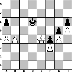 | Partie-Notation im PGN-Format [Event "Zug um Zug gegen Fr"] [Site "www.mySchach.de"] [Date "2010.05.04"] [Round "1"] [White "freizeitspieler"] [Black "Seneca"] [ECO "D02"] [WhitemyELO "1542"] [BlackmyELO "1546"] [Result "1-0"] [TimeControl "10/2592000"] [WhiteDays "177"] [BlackDays "169"] [MySchachNr "65321"] 1. d4 d5 2. Nf3 Bf5 3. g3 h6 4. Bg2 e6 5. O-O Nf6 6. Nbd2 c5 7. c3 Be7 8. Qb3 b6 9. Ne5 O-O 10. Re1 Nfd7 11. e4 c4 12. Qa4 Nxe5 13. dxe5 Bg6 14. exd5 exd5 15. Nxc4 a6 16. Qd1 Ra7 17. Bxd5 b5 18. Ne3 Bc5 19. Qg4 Re7 20. Qxg6 Bxe3 21. Bxe3 Qxd5 22. Qg4 Re6 23. Bd4 Nc6 24. b3 Nxe5 25. Bxe5 Rxe5 26. Rxe5 Qxe5 27. Rc1 Re8 28. Qd4 f5 29. Qxe5 Rxe5 30. Rc2 Kf7 31. f3 Kf6 32. h4 g5 33. h5 f4 34. g4 Re3 35. Kf2 Ke5 36. c4 bxc4 37. Rxc4 Kd5 38. Rc8 Re6 39. Rd8+ Kc6 40. Rg8 Kd7 41. Rg7+ Ke8 42. Rg6 Ke7 43. Rxe6+ Kxe6 44. Ke2 Kd5 45. Kd3 Kc5 46. a3 Kd5 47. b4 Ke5 48. Kc4 Kd6 49. a4 Kc6 50. Kd4 Kd6 51. Ke4 1-0 Stellungs-Notation im FEN-Format 8/8/p2k3p/6pP/PP2KpP1/5P2/8/8 - - - 4 51 Geschlagene Figuren Weiss:                              Geschlagene Figuren Schwarz:                               Klicken Sie auf eine geschlagene Figur um den gewünschten Zug darzustellen!