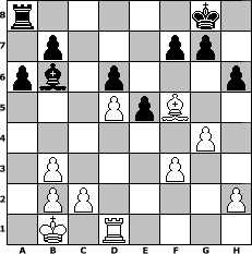 Partie-Notation im PGN-Format [Event "FREUNDESTUNIER"] [Site "www.mySchach.de"] [Date "2005.10.28"] [Round "1"] [White "icke"] [Black "Stecher1"] [ECO "B90"] [WhitemyELO "1343"] [BlackmyELO "1500"] [Result "1/2-1/2"] [TimeControl "10/864000"] [WhiteDays "29"] [BlackDays "23"] [MySchachNr "18944"] 1. e4 c5 2. Nf3 d6 3. d4 cxd4 4. Nxd4 Nf6 5. Nc3 a6 6. Qf3 e5 7. Nde2 Bg4 8. Qg3 h6 9. f3 Bd7 10. Be3 Nh5 11. Qf2 Be6 12. Bb6 Qe7 13. Nd5 Bxd5 14. exd5 Nd7 15. g4 Nf4 16. O-O-O Nxe2+ 17. Bxe2 Nxb6 18. Qxb6 Qd7 19. Rd3 Be7 20. Ra3 O-O 21. Rd1 Bg5+ 22. Kb1 Rfc8 23. Bd3 Bd8 24. Qb4 Rc5 25. Bf5 Qb5 26. Qxb5 Rxb5 27. Rb3 Rxb3 28. axb3 Bb6 1/2-1/2 Stellungs-Notation im FEN-Format r5k1/1p3pp1/pb1p3p/3PpB2/6P1/1P3P2/1PP4P/1K1R4 - - - 1 29 Geschlagene Figuren Weiss: Geschlagene Figuren Schwarz: Klicken Sie auf eine geschlagene Figur um den gewünschten Zug darzustellen!