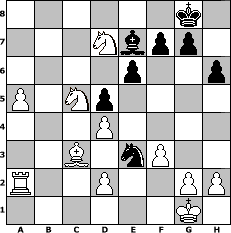 Partie-Notation im PGN-Format [Event "Sommerschach"] [Site "www.mySchach.de"] [Date "2018.05.26"] [Round "1"] [White "FrankB"] [Black "MiFie"] [ECO "D02"] [WhitemyELO "1641"] [BlackmyELO "1080"] [Result "1-0"] [TimeControl "10/2592000"] [WhiteDays "30"] [BlackDays "30"] [MySchachNr "112232"] 1. d4 d5 2. Nf3 Bf5 3. e3 Nf6 4. c4 e6 5. a3 Bd6 6. c5 Be7 7. Nc3 O-O 8. Bd3 Bxd3 9. Qxd3 h6 10. O-O Nc6 11. b4 a6 12. Bb2 b6 13. cxb6 cxb6 14. Rfc1 b5 15. Rc2 a5 16. Nxb5 Ne4 17. Rxc6 Qd7 18. Ne5 Qd8 19. bxa5 Rxa5 20. f3 Nf6 21. Bc3 Ra4 22. Qc2 Qa8 23. Bb2 Qa5 24. Nc3 Ra8 25. Nxa4 Qb5 26. Rc8+ Rxc8 27. Qxc8+ Ne8 28. Qd7 Qxd7 29. Nxd7 Nd6 30. Nac5 Nc4 31. Bc3 Nxe3 32. a4 Nc2 33. Ra2 Ne3 34. a5 1-0 Stellungs-Notation im FEN-Format 6k1/3Nbpp1/4p2p/P1Np4/3P4/2B1nP2/R2P2PP/6K1 - - - 0 34 Geschlagene Figuren Weiss: Geschlagene Figuren Schwarz: Klicken Sie auf eine geschlagene Figur um den gewünschten Zug darzustellen!