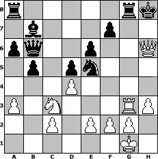 Partie-Notation im PGN-Format [Event "Sommerferien 2010"] [Site "www.mySchach.de"] [Date "2010.06.20"] [Round "2"] [White "Andylein1989"] [Black "Joschi"] [ECO "B10"] [WhitemyELO "1558"] [BlackmyELO "1565"] [Result "1-0"] [TimeControl "10/2592000"] [WhiteDays "90"] [BlackDays "87"] [MySchachNr "66426"] 1. e4 c6 2. Nf3 d5 3. exd5 cxd5 4. d4 Nf6 5. Nc3 Nc6 6. Bf4 a6 7. h3 b5 8. Bd3 e6 9. O-O Bd6 10. Qc1 Bxf4 11. Qxf4 Bb7 12. a3 O-O 13. Rfe1 Qb6 14. Qh4 Na5 15. Ne5 h6 16. Re3 Nc4 17. Rg3 Kh8 18. Re1 Nxb2 19. Ree3 Nxd3 20. Rxg7 Ng8 21. Reg3 Nxe5 22. Rxg8+ Rxg8 23. Qxh6# 1-0 Stellungs-Notation im FEN-Format r5rk/1b3p2/pq2p2Q/1p1pn3/3P4/P1N3RP/2P1PPP1/6K1 - - - 0 23 Geschlagene Figuren Weiss: Geschlagene Figuren Schwarz: Klicken Sie auf eine geschlagene Figur um den gewünschten Zug darzustellen!