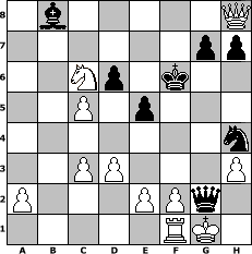 Partie-Notation im PGN-Format [Event "Sommerschach"] [Site "www.mySchach.de"] [Date "2018.05.26"] [Round "1"] [White "MiFie"] [Black "Schefsche"] [ECO "C50"] [WhitemyELO "1080"] [BlackmyELO "1330"] [Result "0-1"] [TimeControl "10/2592000"] [WhiteDays "23"] [BlackDays "29"] [MySchachNr "112205"] 1. e4 e5 2. Nf3 Nc6 3. Bc4 Bc5 4. O-O d6 5. h3 Nd4 6. c3 Ne6 7. b4 Bb6 8. d3 c5 9. Bg5 Nxg5 10. Nxg5 Qxg5 11. Qf3 Nh6 12. Na3 f5 13. Bb5+ Bd7 14. Bxd7+ Kxd7 15. exf5 Raf8 16. Qxb7+ Bc7 17. Nb5 Rc8 18. Nxa7 Nxf5 19. bxc5 Rb8 20. Qc6+ Kd8 21. Rab1 Nh4 22. Rxb8+ Bxb8 23. Qc8+ Ke7 24. Nc6+ Kf6 25. Qxh8 Qxg2# 0-1 Stellungs-Notation im FEN-Format 1b5Q/6pp/2Np1k2/2P1p3/7n/2PP3P/P3PPq1/5RK1 - - - 0 26 Geschlagene Figuren Weiss: Geschlagene Figuren Schwarz: Klicken Sie auf eine geschlagene Figur um den gewünschten Zug darzustellen!