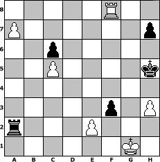 Partie-Notation im PGN-Format [Event "Sweschnikow III"] [Site "www.mySchach.de"] [Date "2012.09.05"] [Round "1"] [White "Naunhofer"] [Black "Joschi"] [ECO "B33"] [WhitemyELO "1627"] [BlackmyELO "1608"] [Result "1/2-1/2"] [TimeControl "10/1728000"] [WhiteDays "18"] [BlackDays "20"] [MySchachNr "83734"] 1. e4 c5 2. Nf3 Nc6 3. d4 cxd4 4. Nxd4 Nf6 5. Nc3 e5 6. Nxc6 bxc6 7. Bg5 Be7 8. Bd3 O-O 9. O-O d5 10. Bxf6 Bxf6 11. f4 exf4 12. exd5 Bxc3 13. bxc3 Qxd5 14. Rxf4 Qc5+ 15. Kh1 Qxc3 16. Rb1 Be6 17. Qf3 Qc5 18. Rh4 g6 19. Qf6 Rae8 20. a4 Qe7 21. Qxe7 Rxe7 22. a5 Bd5 23. c4 Rfe8 24. Rf4 Be6 25. a6 Bc8 26. c5 Re1+ 27. Rf1 Rxf1+ 28. Bxf1 Kg7 29. g3 Re5 30. Rc1 Be6 31. Kg2 Bd5+ 32. Kf2 Rh5 33. h3 Rf5+ 34. Kg1 Rf3 35. g4 Rb3 36. Kh2 Be4 37. Re1 f5 38. gxf5 gxf5 39. Rc1 Bd3 40. Bxd3 Rxd3 41. Rb1 Ra3 42. Rb7+ Kh6 43. Rxa7 f4 44. Ra8 f3 45. a7 Ra2+ 46. Kg1 Kh5 47. Rf8 1/2-1/2 Stellungs-Notation im FEN-Format 5R2/P6p/2p5/2P4k/8/5p1P/r3P3/6K1 - - - 4 47 Geschlagene Figuren Weiss: Geschlagene Figuren Schwarz: Klicken Sie auf eine geschlagene Figur um den gewünschten Zug darzustellen!