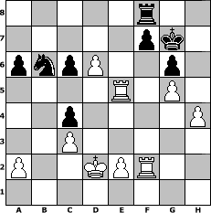 Partie-Notation im PGN-Format [Event "Sommerschach 2009"] [Site "www.mySchach.de"] [Date "2009.06.09"] [Round "2"] [White "Robert"] [Black "Andreas"] [ECO "C50"] [WhitemyELO "1617"] [BlackmyELO "1541"] [Result "0-1"] [TimeControl "10/864000"] [WhiteDays "00"] [BlackDays "07"] [MySchachNr "56478"] 1. e4 e5 2. Nf3 Nc6 3. Bc4 Nd4 4. c3 Nxf3+ 5. Qxf3 Qf6 6. Qe3 b6 7. d4 c6 8. Nd2 b5 9. dxe5 Qxe5 10. Nf3 Qc5 11. Bb3 Nf6 12. Qf4 Be7 13. h3 O-O 14. g4 Ba6 15. Be3 Qd6 16. Qxd6 Bxd6 17. O-O-O Bc7 18. e5 Nd5 19. Bd4 Nf4 20. Bc5 Nd5 21. Bxf8 Kxf8 22. Rhe1 Nb6 23. Nd2 Re8 24. f4 c5 25. Ne4 c4 26. Bc2 Bb7 27. Nd6 Bxd6 28. exd6 Rc8 29. Rd2 g6 30. Re5 a6 31. f5 Bc6 32. fxg6 hxg6 33. Rf2 Kg7 34. h4 Nd5 35. g5 Rf8 36. Kd2 b4 37. Be4 bxc3+ 38. bxc3 Nb6 39. Bxc6 dxc6 0-1 Stellungs-Notation im FEN-Format 5r2/5pk1/pnpP2p1/4R1P1/2p4P/2P5/P2KPR2/8 - - - 0 40 Geschlagene Figuren Weiss: Geschlagene Figuren Schwarz: Klicken Sie auf eine geschlagene Figur um den gewünschten Zug darzustellen!