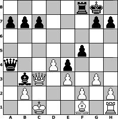 Partie-Notation im PGN-Format [Event "RDK-Open 2008"] [Site "www.mySchach.de"] [Date "2008.08.01"] [Round "1"] [White "brucybabe"] [Black "Koprek"] [ECO "A25"] [WhitemyELO "1690"] [BlackmyELO "1815"] [Result "0-1"] [TimeControl "10/1728000"] [WhiteDays "20"] [BlackDays "20"] [MySchachNr "46722"] 1. c4 e5 2. Nc3 Nc6 3. g3 f5 4. Bg2 Nf6 5. d3 Bb4 6. Bd2 O-O 7. e3 Bxc3 8. Bxc3 d5 9. cxd5 Nxd5 10. Ne2 Be6 11. Qd2 Qd6 12. O-O-O Nxc3 13. Nxc3 Rad8 14. Qe2 Nb4 15. d4 Nxa2+ 16. Nxa2 Bxa2 17. Qc2 e4 18. Bf1 Qe6 19. Qc3 Rd6 20. Kd2 Bb3 21. Rc1 Rc6 22. Qb4 Rxc1 23. Kxc1 Qc6+ 24. Qc3 Qa4 0-1 Stellungs-Notation im FEN-Format 5rk1/ppp3pp/8/5p2/q2Pp3/1bQ1P1P1/1P3P1P/2K2B1R - - - 3 25 Geschlagene Figuren Weiss: Geschlagene Figuren Schwarz: Klicken Sie auf eine geschlagene Figur um den gewünschten Zug darzustellen!