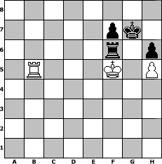 Partie-Notation im PGN-Format [Event "1.) MySchach-960-Mannschaftsturnier 2012"] [Site "www.mySchach.de"] [Date "2012.10.25"] [Round "1"] [Board "4"] [White "Hobbykegler"] [Black "mudb"] [Variant "Fischerrandom"] [SetUp "1"] [FEN "bbqnnrkr/pppppppp/8/8/8/8/PPPPPPPP/BBQNNRKR w KQkq - 0 1"] [WhitemyELO "1116"] [BlackmyELO "1165"] [Result "1/2-1/2"] [TimeControl "10/2592000"] [WhiteDays "120"] [BlackDays "077"] [MySchachNr "84664"] 1. d4 c5 2. b3 d5 3. dxc5 Qxc5 4. Qd2 h6 5. Nd3 Qb6 6. Ne3 Qd6 7. Nf5 Qg6 8. O-O-O Qxf5 9. f4 b6 10. h3 Nd6 11. Rhf1 Ne4 12. Qe3 Nc6 13. g4 Qf6 14. Bxf6 exf6 15. f5 Bb7 16. c4 Ne5 17. Nxe5 Bxe5 18. cxd5 Nc3 19. Rd3 Rc8 20. h4 O-O 21. Kd2 Nxb1+ 22. Rxb1 Rc5 23. g5 Bxd5 24. gxf6 Bxf6 25. h5 Ra5 26. a4 Rc5 27. b4 Rc4 28. Rg1 Bg5 29. Rxd5 Bxe3+ 30. Kxe3 Rxb4 31. f6 Re8+ 32. Kf3 Kf8 33. fxg7+ Kg8 34. e4 Rbxe4 35. Rd6 Re3+ 36. Kf4 R3e4+ 37. Kf5 R4e5+ 38. Kf6 R8e6+ 39. Rxe6 Rxe6+ 40. Kf5 a6 41. Rg4 b5 42. axb5 axb5 43. Rb4 Kxg7 44. Rxb5 Rf6+ 45. Ke5 Re6+ 46. Kf5 Rf6+ 1/2-1/2 Stellungs-Notation im FEN-Format 8/5pk1/5r1p/1R3K1P/8/8/8/8 - - - 5 47 Geschlagene Figuren Weiss: Geschlagene Figuren Schwarz: Klicken Sie auf eine geschlagene Figur um den gewünschten Zug darzustellen!