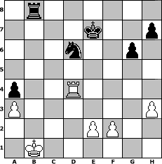 Partie-Notation im PGN-Format [Event "Albspiele 27"] [Site "www.mySchach.de"] [Date "2013.02.10"] [Round "1"] [White "Haki"] [Black "Knight"] [ECO "B20"] [WhitemyELO "1245"] [BlackmyELO "1183"] [Result "1/2-1/2"] [TimeControl "10/1728000"] [WhiteDays "20"] [BlackDays "20"] [MySchachNr "86473"] 1. e4 c5 2. d4 cxd4 3. c3 dxc3 4. Nxc3 Nc6 5. Nf3 e5 6. Bc4 Bc5 7. Bxf7+ Kxf7 8. Qd5+ Kf8 9. Qxc5+ d6 10. Qa3 Nf6 11. Be3 a6 12. O-O-O Bg4 13. h3 Bxf3 14. gxf3 Ne8 15. f4 b5 16. Kb1 Nc7 17. Bc5 Ne8 18. Bxd6+ Nxd6 19. Qxd6+ Qxd6 20. Rxd6 Na5 21. fxe5 Nc4 22. e6 Nxd6 23. Nd5 Nxe4 24. e7+ Kf7 25. Re1 Nd6 26. a3 a5 27. Nc7 Rac8 28. Ne6 g6 29. Nd8+ Rcxd8 30. exd8=Q Rxd8 31. b3 a4 32. bxa4 bxa4 33. Rd1 Ke7 34. Rd4 Rb8+ 1/2-1/2 Stellungs-Notation im FEN-Format 1r6/4k2p/3n2p1/8/p2R4/P6P/4PP2/1K6 - - - 4 35 Geschlagene Figuren Weiss: Geschlagene Figuren Schwarz: Klicken Sie auf eine geschlagene Figur um den gewünschten Zug darzustellen!