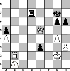 Partie-Notation im PGN-Format [Event "Das 1400er-Turnier"] [Site "www.mySchach.de"] [Date "2009.04.06"] [Round "2"] [White "faustballer"] [Black "Master1"] [ECO "A00"] [WhitemyELO "1460"] [BlackmyELO "1386"] [Result "1-0"] [TimeControl "10/1728000"] [WhiteDays "100"] [BlackDays "090"] [MySchachNr "54633"] 1. Nc3 e5 2. e4 Bb4 3. Nd5 Bc5 4. g3 Nf6 5. Qf3 Nxd5 6. exd5 d6 7. d3 O-O 8. Be3 Bxe3 9. Qxe3 Bg4 10. Bg2 Nd7 11. h3 Bf5 12. b4 Nf6 13. Ne2 Re8 14. Be4 Bxe4 15. dxe4 h6 16. O-O Qd7 17. Nec3 a6 18. a4 b6 19. Kg2 Rab8 20. f3 c6 21. dxc6 Qxc6 22. Rd1 Red8 23. Ra2 Rbc8 24. Rd3 Kh7 25. g4 d5 26. exd5 Nxd5 27. Qe4+ g6 28. Nxd5 f6 29. Ne7 Qxe4 30. fxe4 Rxd3 31. cxd3 Rc3 32. b5 a5 33. Nd5 Rxd3 34. Nxf6+ Kg7 35. Nd5 Rd4 36. Nxb6 Rxe4 37. Nd7 Re3 38. Rb2 e4 39. b6 Rd3 40. b7 Rxd7 41. b8=Q e3 42. Qe5+ 1-0 Stellungs-Notation im FEN-Format 8/3r2k1/6pp/p3Q3/P5P1/4p2P/1R4K1/1N6 - - - 1 42 Geschlagene Figuren Weiss: Geschlagene Figuren Schwarz: Klicken Sie auf eine geschlagene Figur um den gewünschten Zug darzustellen!