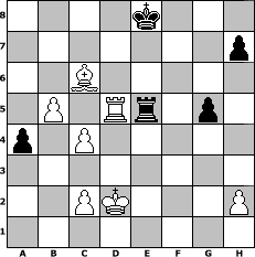 Partie-Notation im PGN-Format [Event "Der HSF feiert Geburtstag-feiert gerne dabei mit!"] [Site "www.mySchach.de"] [Date "2012.05.01"] [Round "1"] [White "haggard"] [Black "Lohl"] [ECO "A30"] [WhitemyELO "1990"] [BlackmyELO "1832"] [Result "1-0"] [TimeControl "10/2592000"] [WhiteDays "30"] [BlackDays "24"] [MySchachNr "81489"] 1. c4 c5 2. g3 e6 3. Bg2 d5 4. Nf3 Nf6 5. O-O Nc6 6. b3 Be7 7. e3 O-O 8. Bb2 d4 9. exd4 cxd4 10. Re1 Ne8 11. d3 f6 12. a3 a5 13. Nbd2 e5 14. Nh4 Be6 15. f4 Nc7 16. Qh5 g6 17. Qe2 exf4 18. gxf4 Re8 19. Qf2 f5 20. Nhf3 Bf6 21. Re2 Qd6 22. Ne5 Nxe5 23. fxe5 Bxe5 24. Rxe5 Qxe5 25. Bxd4 Qd6 26. Ne4 Qe7 27. Nf6+ Kf7 28. Re1 Rad8 29. Nxe8 Rxe8 30. Qf4 Rd8 31. Bb6 Rxd3 32. Bxc7 a4 33. Qh6 Kg8 34. b4 Qf7 35. Be5 f4 36. Rf1 Qf8 37. Qxf8+ Kxf8 38. Rxf4+ Ke8 39. Bxb7 Rxa3 40. b5 g5 41. Bc6+ Bd7 42. Rd4 Ra1+ 43. Kf2 Ra2+ 44. Ke3 Ra1 45. Rxd7 Re1+ 46. Kd2 Rxe5 47. Rd5+ 1-0 Stellungs-Notation im FEN-Format 4k3/7p/2B5/1P1Rr1p1/p1P5/8/2PK3P/8 - - - 1 47 Geschlagene Figuren Weiss: Geschlagene Figuren Schwarz: Klicken Sie auf eine geschlagene Figur um den gewünschten Zug darzustellen!