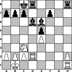 Partie-Notation im PGN-Format [Event "Krampusturnier"] [Site "www.mySchach.de"] [Date "2012.11.25"] [Round "1"] [White "Knight"] [Black "Joschi"] [ECO "A45"] [WhitemyELO "1172"] [BlackmyELO "1597"] [Result "0-1"] [TimeControl "10/1728000"] [WhiteDays "20"] [BlackDays "20"] [MySchachNr "85182"] 1. d4 Nf6 2. g4 Nxg4 3. e4 d6 4. Be2 Nf6 5. Nc3 e5 6. dxe5 dxe5 7. Nf3 Bd6 8. Bg5 h6 9. Bh4 g5 10. Nxg5 hxg5 11. Bxg5 Be6 12. Qd2 Nc6 13. O-O-O Nd4 14. Bxf6 Qxf6 15. Kb1 Nxe2 16. Nxe2 Qxf2 17. Nc3 Qxd2 18. Rxd2 O-O-O 0-1 Stellungs-Notation im FEN-Format 2kr3r/ppp2p2/3bb3/4p3/4P3/2N5/PPPR3P/1K5R - - - 1 19 Geschlagene Figuren Weiss: Geschlagene Figuren Schwarz: Klicken Sie auf eine geschlagene Figur um den gewünschten Zug darzustellen!