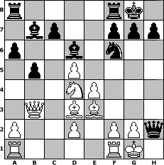 Partie-Notation im PGN-Format [Event "Marshall Plan"] [Site "www.mySchach.de"] [Date "2009.02.02"] [Round "1"] [White "Caligula"] [Black "Zargoz"] [ECO "D06"] [WhitemyELO "1334"] [BlackmyELO "1446"] [Result "0-1"] [TimeControl "10/2592000"] [WhiteDays "60"] [BlackDays "18"] [MySchachNr "52363"] 1. d4 d5 2. c4 Nf6 3. Nf3 dxc4 4. e3 b5 5. b3 cxb3 6. Qxb3 a6 7. Ne5 e6 8. Nc3 Bd6 9. Nf3 Nc6 10. Bd3 Bb7 11. O-O O-O 12. e4 e5 13. d5 Nd4 14. Nxd4 exd4 15. Ne2 Qe8 16. Nxd4 Qe5 17. Be3 Qxh2# 0-1 Stellungs-Notation im FEN-Format r4rk1/1bp2ppp/p2b1n2/1p1P4/3NP3/1Q1BB3/P2P1PPq/R4RK1 - - - 0 18 Geschlagene Figuren Weiss: Geschlagene Figuren Schwarz: Klicken Sie auf eine geschlagene Figur um den gewünschten Zug darzustellen!