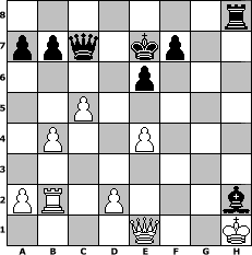 Partie-Notation im PGN-Format [Event "Zwischendurch mal ein paar eigene Z"] [Site "www.mySchach.de"] [Date "2009.06.25"] [Round "1"] [White "Knight"] [Black "Winston"] [ECO "A40"] [WhitemyELO "1131"] [BlackmyELO "1462"] [Result "0-1"] [TimeControl "10/1728000"] [WhiteDays "76"] [BlackDays "60"] [MySchachNr "56969"] 1. d4 c6 2. e4 e6 3. Nc3 d5 4. e5 Qc7 5. Nf3 c5 6. dxc5 Bxc5 7. Bb5+ Bd7 8. Bxd7+ Nxd7 9. O-O Nxe5 10. Nxe5 Qxe5 11. Re1 Qd6 12. g3 Qb6 13. Qe2 h6 14. b3 Rc8 15. Bb2 Nf6 16. Nxd5 Nxd5 17. Bxg7 Rg8 18. Bxh6 Nf6 19. c4 Ng4 20. Be3 Nxe3 21. fxe3 Ke7 22. Kh1 Rh8 23. e4 Rcg8 24. Rab1 Rxg3 25. Rb2 Re3 26. Qf1 Rxe1 27. Qxe1 Qc7 28. b4 Bd6 29. c5 Bxh2 0-1 Stellungs-Notation im FEN-Format 7r/ppq1kp2/4p3/2P5/1P2P3/8/PR1P3b/4Q2K - - - 0 30 Geschlagene Figuren Weiss: Geschlagene Figuren Schwarz: Klicken Sie auf eine geschlagene Figur um den gewünschten Zug darzustellen!