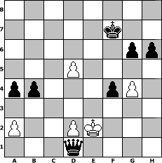 Partie-Notation im PGN-Format [Event "Love, Peace and Harmony 1"] [Site "www.mySchach.de"] [Date "2010.05.08"] [Round "1"] [White "Gauss1233"] [Black "ujack1961"] [ECO "A50"] [WhitemyELO "1448"] [BlackmyELO "1598"] [Result "0-1"] [TimeControl "10/864000"] [WhiteDays "32"] [BlackDays "48"] [MySchachNr "65457"] 1. d4 Nf6 2. c4 d5 3. Nc3 g6 4. e3 Bg7 5. Nf3 O-O 6. cxd5 Nxd5 7. Bc4 Nxc3 8. bxc3 c5 9. O-O cxd4 10. cxd4 Bg4 11. h3 Bd7 12. Rb1 b6 13. Bd5 Bc6 14. Bxc6 Nxc6 15. d5 Ne5 16. e4 Rc8 17. Bf4 Nxf3+ 18. Qxf3 e5 19. Be3 f5 20. exf5 Rxf5 21. Qe4 Qd6 22. g4 Rf7 23. Rfc1 Rfc7 24. Rxc7 Rxc7 25. Rc1 Rxc1+ 26. Kg2 a5 27. Bxc1 b5 28. Bb2 b4 29. h4 a4 30. f4 exf4 31. Bxg7 Kxg7 32. Kf3 h6 33. Qd4+ Kf7 34. Qd3 Qe5 35. Qd1 Qe3+ 36. Kg2 Qg3+ 37. Kf1 Qh3+ 38. Kf2 Qxh4+ 39. Kf1 Qh1+ 40. Ke2 Qxd1+ 0-1 Stellungs-Notation im FEN-Format 8/5k2/6pp/3P4/pp3pP1/8/P2PK3/3q4 - - - 0 41 Geschlagene Figuren Weiss: Geschlagene Figuren Schwarz: Klicken Sie auf eine geschlagene Figur um den gewünschten Zug darzustellen!