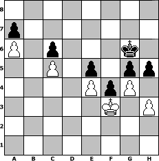 Partie-Notation im PGN-Format [Event "2. Norderstedter DENK MAL Open 2011"] [Site "www.mySchach.de"] [Date "2011.06.02"] [Round "1"] [White "morchel"] [Black "Joschi"] [ECO "B11"] [WhitemyELO "1493"] [BlackmyELO "1531"] [Result "1/2-1/2"] [TimeControl "10/2592000"] [WhiteDays "30"] [BlackDays "30"] [MySchachNr "74294"] 1. e4 c6 2. Nc3 d5 3. Nf3 dxe4 4. Nxe4 Nd7 5. d4 Ngf6 6. Bd3 Nxe4 7. Bxe4 Nf6 8. Qe2 Bg4 9. h3 Nxe4 10. Qxe4 Bxf3 11. Qxf3 Qxd4 12. O-O e6 13. Rd1 Qb6 14. Be3 Bc5 15. Bxc5 Qxc5 16. Rd2 O-O 17. Rad1 Qb6 18. b3 Rad8 19. c4 Rxd2 20. Rxd2 Rd8 21. Rxd8+ Qxd8 22. Qe2 Qd4 23. a4 g6 24. g3 Kg7 25. Kg2 e5 26. Qe3 Qxe3 27. fxe3 f5 28. b4 Kf6 29. Kf3 g5 30. g4 f4 31. e4 Ke6 32. c5 b6 33. a5 Kd7 34. a6 Kc7 35. Kf2 h6 36. Kf3 bxc5 37. bxc5 Kd7 38. Kf2 Ke6 39. Kf3 Kf6 40. Kf2 Kg6 41. Kf3 h5 42. Kf2 Kh6 43. Kf3 Kg6 1/2-1/2 Stellungs-Notation im FEN-Format 8/p7/P1p3k1/2P1p1pp/4PpP1/5K1P/8/8 - - - 4 44 Geschlagene Figuren Weiss: ![]() ![]() ![]() ![]() ![]() ![]() ![]() ![]() ![]() ![]() ![]() ![]() ![]() ![]() ![]() Geschlagene Figuren Schwarz: ![]() ![]() ![]() ![]() ![]() ![]() ![]() ![]() ![]() ![]() ![]() ![]() ![]() ![]() ![]() Klicken Sie auf eine geschlagene Figur um den gewünschten Zug darzustellen!