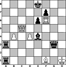 Partie-Notation im PGN-Format [Event "4. Wikingermeisterschaft"] [Site "www.mySchach.de"] [Date "2008.04.07"] [Round "1"] [White "Master1"] [Black "73DADDELDU37"] [ECO "A40"] [WhitemyELO "1307"] [BlackmyELO "1464"] [Result "0-1"] [TimeControl "10/2592000"] [WhiteDays "30"] [BlackDays "30"] [MySchachNr "44141"] 1. d4 c6 2. c4 e6 3. a3 d5 4. c5 b6 5. cxb6 axb6 6. Nc3 Ba6 7. Nf3 Bd6 8. Be3 Nf6 9. Bg5 Nbd7 10. b4 b5 11. e3 h6 12. Bh4 Qc7 13. Be2 Bb7 14. O-O Ne4 15. Nxe4 dxe4 16. Nd2 Bxh2+ 17. Kh1 g5 18. g3 gxh4 19. Kxh2 hxg3+ 20. fxg3 h5 21. Nxe4 h4 22. Rf3 hxg3+ 23. Kg2 Rh2+ 24. Kg1 g2 25. Kf2 Rh1 26. Qc2 Rxa1 27. Kxg2 R1xa3 28. Nf6+ Nxf6 29. Rxf6 Ra2 30. Qd3 c5+ 31. e4 R8a3 32. Qxb5+ Bc6 33. Qxc5 Qg3+ 34. Kh1 Ra1+ 35. Bf1 Bxe4+ 0-1 Stellungs-Notation im FEN-Format 4k3/5p2/4pR2/2Q5/1P1Pb3/r5q1/8/r4B1K - - - 0 36 Geschlagene Figuren Weiss: Geschlagene Figuren Schwarz: Klicken Sie auf eine geschlagene Figur um den gewünschten Zug darzustellen!