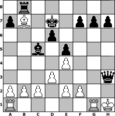 Partie-Notation im PGN-Format [Event "Dabei ist alles 6"] [Site "www.mySchach.de"] [Date "2009.03.21"] [Round "1"] [White "gunni50"] [Black "Andylein1989"] [ECO "C50"] [WhitemyELO "1308"] [BlackmyELO "1606"] [Result "0-1"] [TimeControl "10/864000"] [WhiteDays "10"] [BlackDays "10"] [MySchachNr "54081"] 1. e4 e5 2. Nf3 Nc6 3. Bc4 Bc5 4. O-O Nf6 5. Nc3 d6 6. d3 Bg4 7. Bg5 Nd4 8. Bxf6 Qxf6 9. Nd5 Qd8 10. h3 Bxf3 11. gxf3 Qg5+ 12. Kh1 Qh4 13. Nxc7+ Kd7 14. Nxa8 Qxh3+ 15. Kg1 Nxf3+ 16. Qxf3 Qxf3 17. Bd5 Rxa8 18. Bxb7 Qg4+ 19. Kh1 Rb8 20. Rg1 Qh3# 0-1 Stellungs-Notation im FEN-Format 1r6/pB1k1ppp/3p4/2b1p3/4P3/3P3q/PPP1PP2/R5RK - - - 5 21 Geschlagene Figuren Weiss: Geschlagene Figuren Schwarz: Klicken Sie auf eine geschlagene Figur um den gewünschten Zug darzustellen!